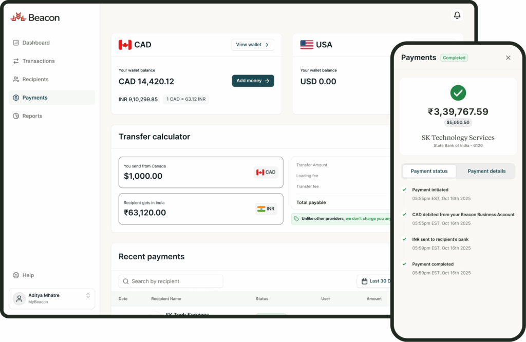Beacon 4 Business is a modern business banking and cross-border payments platform built for Canadian businesses that need to send and receive money domestically and internationally.